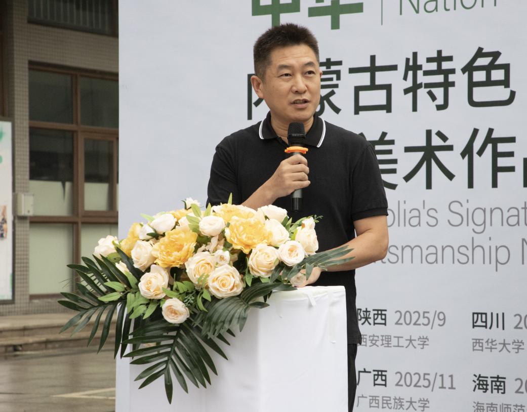西南交通大学 建筑学院党委委员、美术学系主任 舒兴川 在致辞中表示,此次巡展既为观众提供了近距离感受北疆艺术魅力的窗口,更为川蒙两地艺术家搭建了对话平台。我们期待以文化为媒,通过作品互鉴、技艺交流,探索传统工艺与现代设计的融合路径,携手铸牢中华民族共同体意识。
