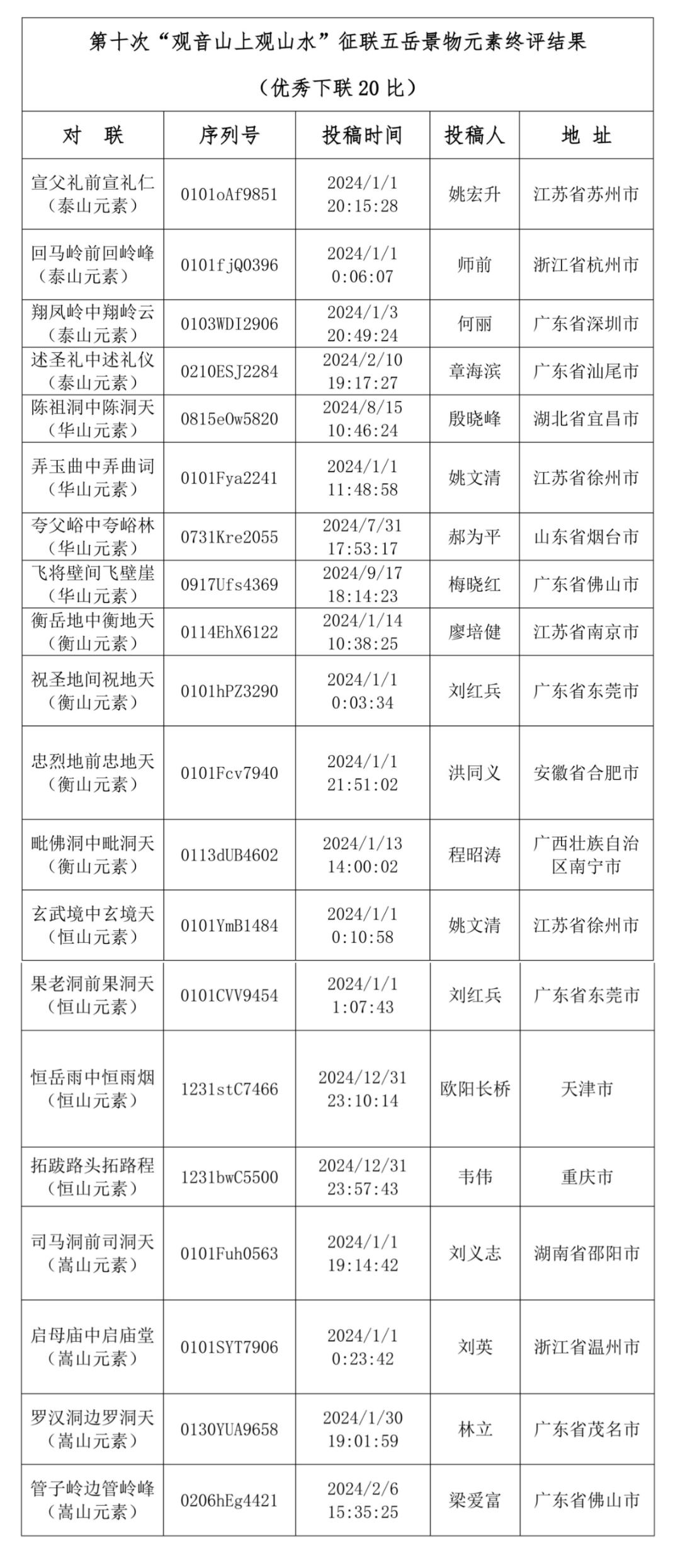 东莞观音山相关负责人表示,践行初心以圆山梦,为弘扬中华优秀传统文化,普及中国楹联文化知识,壮观音山山门,2024年1月1日广东观音山启动第十次“观音山上观山水”征联活动。截至2024年12月31日24:00,历经一年,本轮征联活动总收稿量243577句,其中以观音山元素创作的下联有197286句,以东岳泰山元素创作的投稿作品有15311句,以西岳华山元素创作的投稿作品有8616句,以南岳衡山元素创作的投稿作品有7917句,以北岳恒山元素创作的投稿作品有8786句,以中岳嵩山元素创作的投稿作品有5661句。遗憾的是未能评出符合征联启事要求的“最佳下联”,山梦未圆。