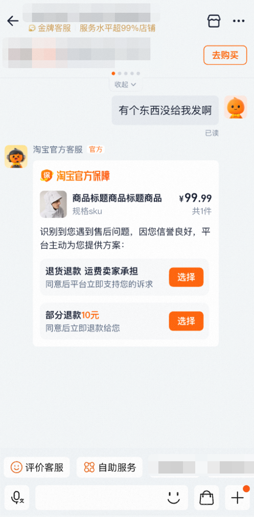 此外,淘宝也正式上线“淘宝官方保障”服务,在售后过程中,消费者如遇到商家超时未处理情形,将会触发服务升级,淘宝官方客服保障介入,在识别问题后,会推荐多个解决方案以供选择,充分保障消费者正当权益。